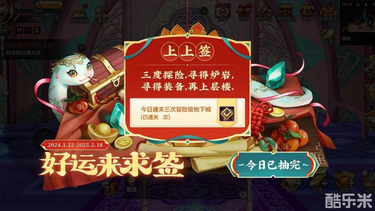 活动内容:活动期间,每日可以抽签获得签文,完成签文中的任务获得奖励。