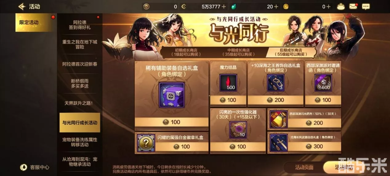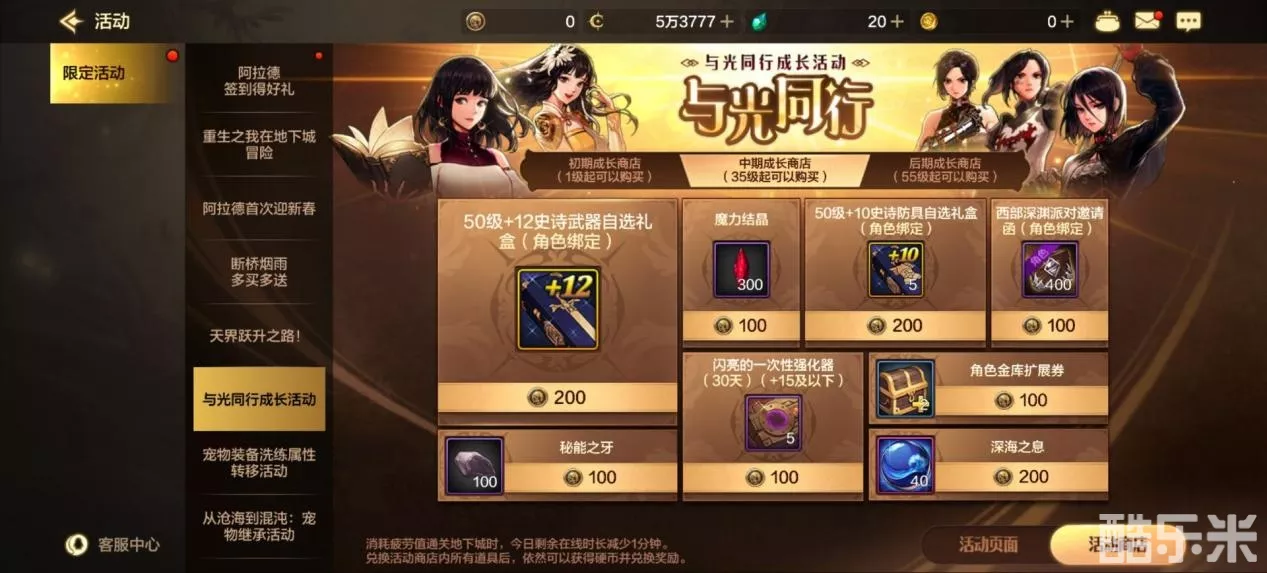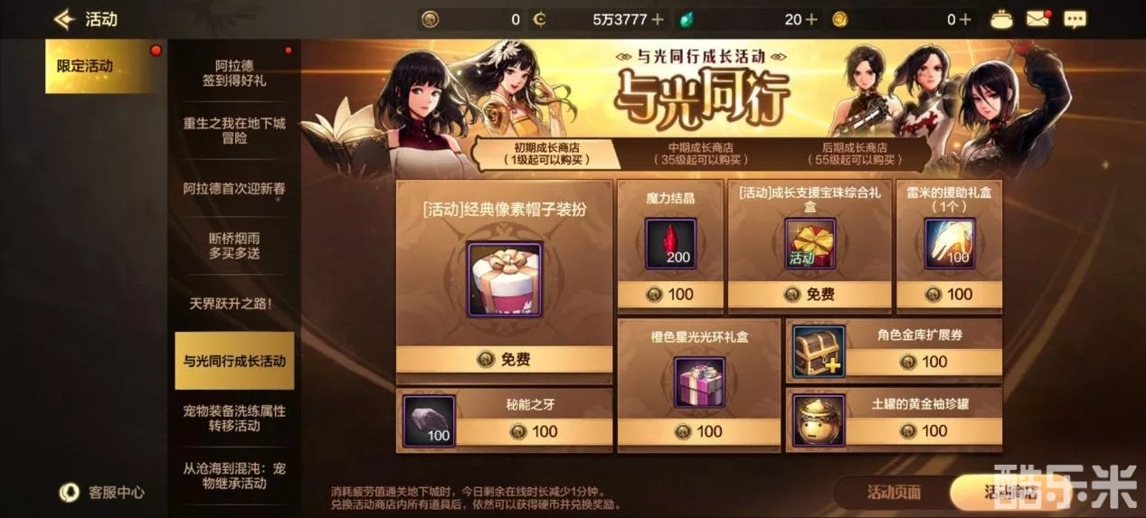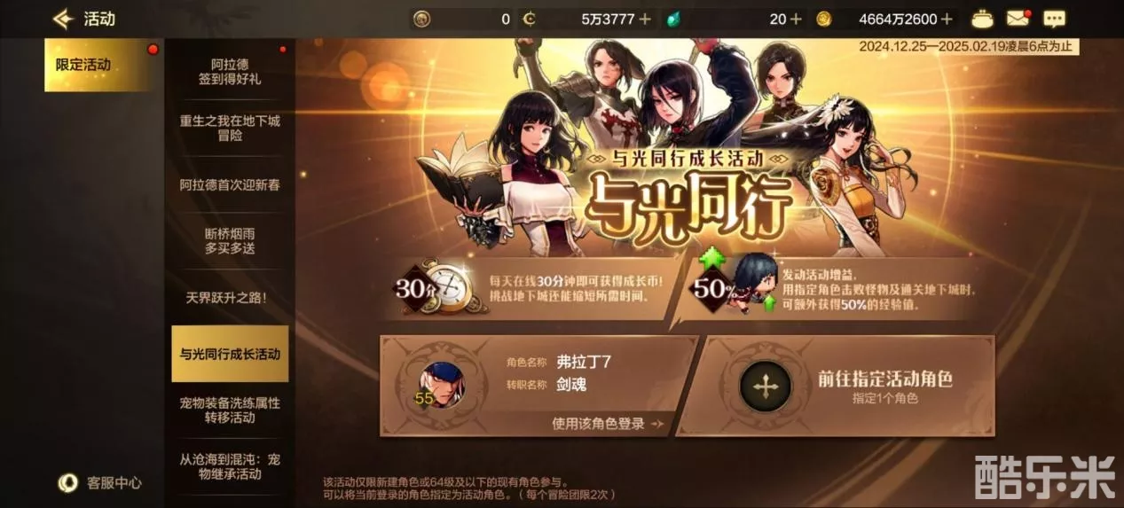 2025.01.13可以指定第2个角色参加与光同行成长活动,活动奖励形式依旧是每天在线30分钟即可获得200成长币,或是消耗疲劳值加快获得成长币。