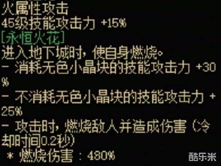 火属性赋予武器,攻击时给敌人挂一层灼烧BUFF,比较依赖攻击段数且武器中的45级等级技攻为假技攻属性特效伤害都吃不到。