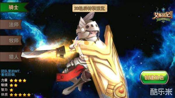 骑士——来自圣都的骑士是守卫王城的主要力量,在师傅的带领下逐渐修炼成为了一名象征正义的骑士,保护同伴,使用天使之力肃清一切黑暗力量,将成为团队中指挥官,使用剑和盾牌抵挡一切来自邪恶势力的攻击。