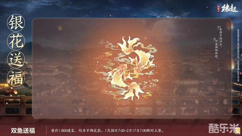 新春盛宴,怎能少得了烟火作配?全新贺岁烟花「双鱼送福」腾空而绽,银花簇簇映照着天穹,双鲤腾跃其中,彩云环抱金鳞,寓意鲤跃龙门,福运连绵,也以此祝福各位侠士好事成双,年年有余!