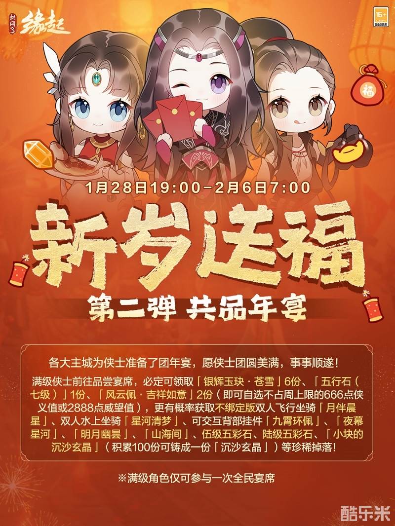 金盘玉盏话丰年,除夕欢宴庆团圆。除夕当夜,我们在各大主城为侠士们准备了团年宴,满级侠士前往品尝年宴,必定获得「银辉玉玦·苍雪」6份、「五行石(七级)」1份、「风云佩·吉祥如意」2份,还有机会可获得不绑定版双人飞行坐骑、可交互背部挂件、五彩石、「小块的沉沙玄晶」等珍稀奖励!祝愿侠士们在新的一年团团圆圆,幸福美满!