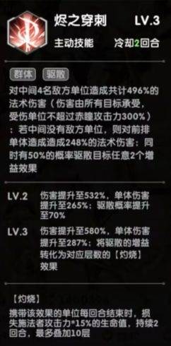 技能分析主动技能:烬值穿刺对中间4名敌方单位造成共计496%的法术伤害(伤害由所有目标承受,受伤单位不超过赤瞳攻击力300%);若中间没有敌方单位,则对前排单位造成248%的法术伤害;同时有50%的概率驱散目标任意2个增益效果