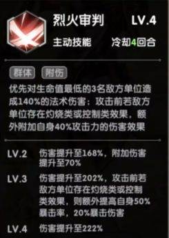 主动技能:烈火审判优先对生命增最低的3名敌方单位造成140%的法术伤害;攻击前若敌方单位存在灼烧类或控制类效果,额外附加自身40%攻击力的伤害效果