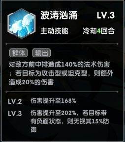 再接着就是月河一技能:波涛汹涌,打前中排,对攻击型和防御型英雄造成额外伤害,同时3级技能对负面状态的英雄,无视其百分之15的防御,我们前面已有减速,所以我们的伤害可以拉满。