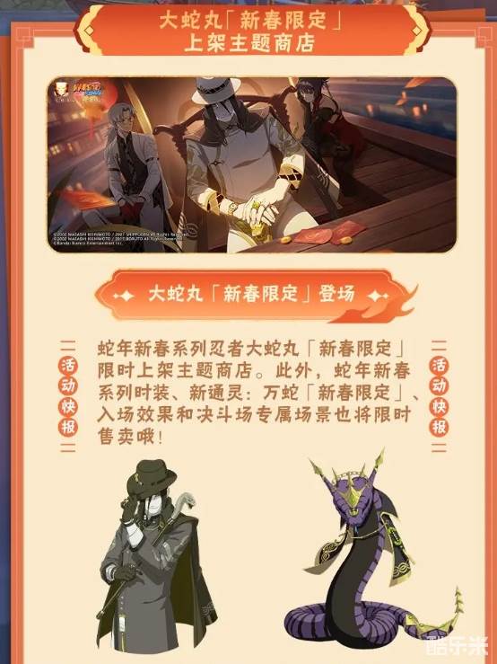 蛇年新春系列忍者大蛇丸「新春限定」限时上架主题商店。此外,蛇年新春系列时装、新通灵:万蛇「新春限定」、入场效果和决斗场专属场景也将限时售卖哦!