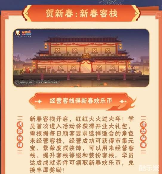《火影忍者手游》贺新春:新春客栈活动内容是什么,很多玩家都想知道这个活动的具体内容是什么,活动能够获取什么奖励,那么下面和酷乐米小编一起来看看吧