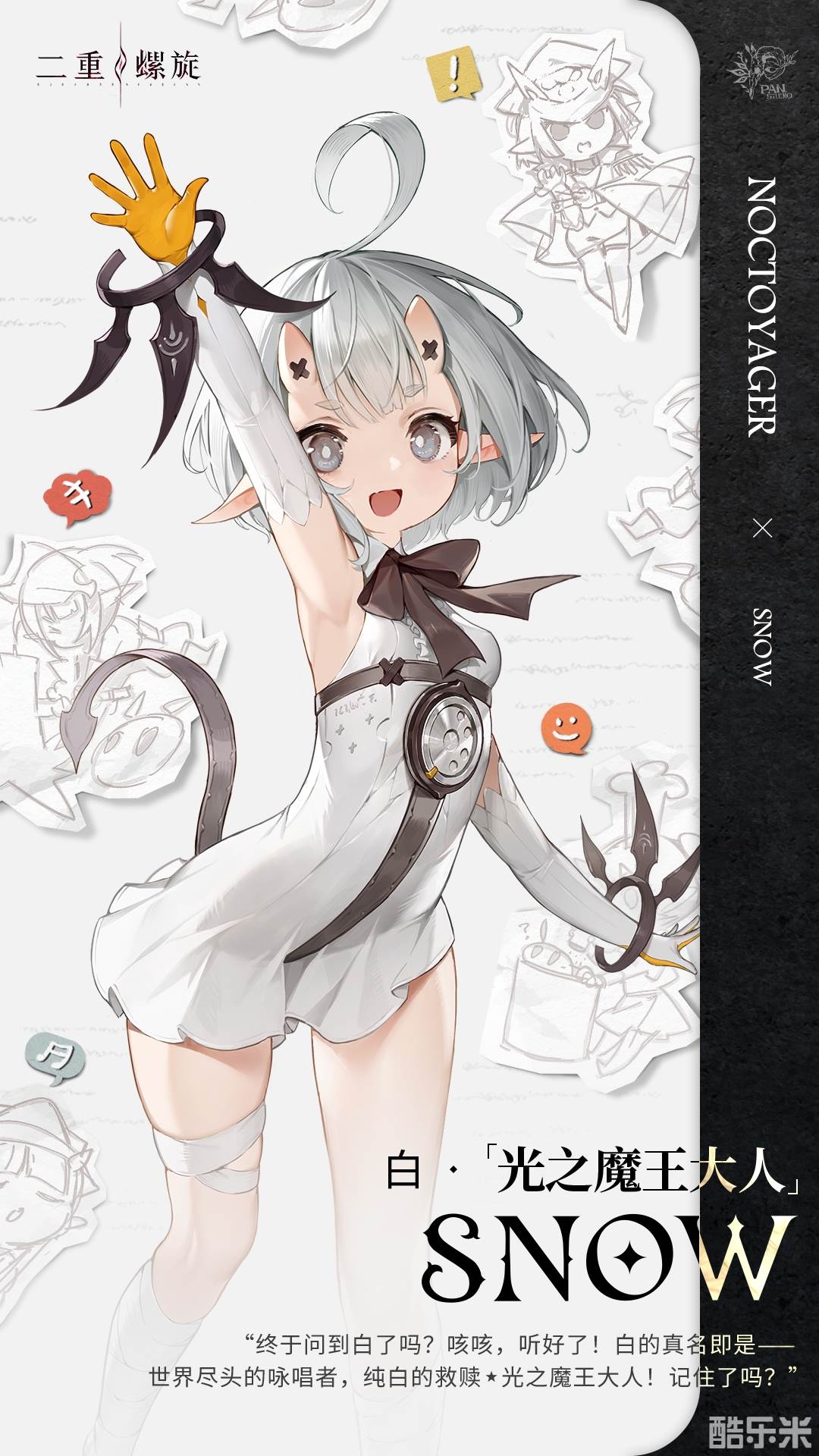 敌人如潮水般涌来的极限战斗中,你可以自由使用远近程攻击和空中射击、下落攻击等组合操作,构筑立体战斗体系,体验以一敌十的无尽割草快感。下面酷乐米小编给大家带来的《二重螺旋》光之魔王大人白角色档案,感兴趣的小伙伴们一起来看看吧。