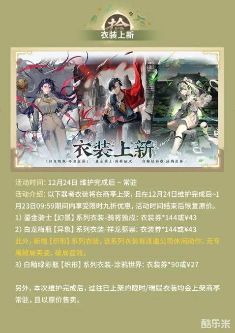 活动介绍:以下器者衣装将在商亭上架,且在12月24日维护完成后~1月23日09:59期间内享受限时九折优惠,活动时间结束后恢复原价。1)鎏金骑士【幻景】系列衣装-骑将独戍:衣装券*144或¥432)白龙梅瓶【异象】系列衣装-祥龙驱祟: 衣装券*144或¥43