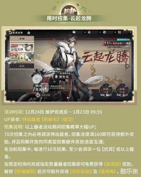 《物华弥新》游戏中,开启的限时招集-云起龙腾特出器者【铜坐龙】(宿卫)迎来up,想要抽取的玩家可以抓紧时间抽取了,很多玩家都想知道具体的活动内容是什么,那么下面和酷乐米小编一起来看看吧