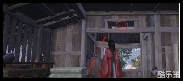2、在屋内的房梁上然后就需要我们从床上跳到柜子上这时候再跳上房梁即可。