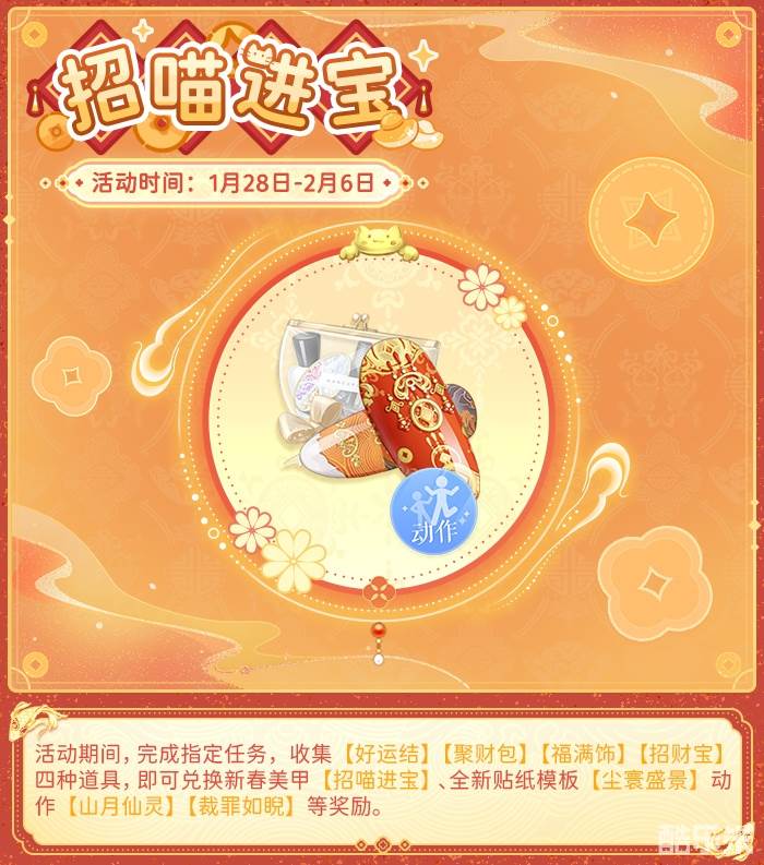 活动期间,完成指定任务,收集【好运结】【聚财包】【福满饰】【招财宝】四种道具,兑换新春美甲【招喵进宝】、全新贴纸模板【尘寰盛景】、动作【山月仙灵】【裁罪如睨】等奖励。