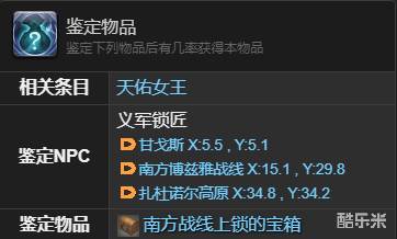1、去甘戈斯 X:5.5 , Y:5.1、南方博兹雅战线 X:15.1 , Y:29.8、扎杜诺尔高原 X:34.8 , Y:34.2.找义军锁匠,鉴定南方战线上锁的宝箱获得。