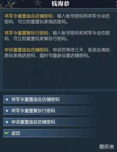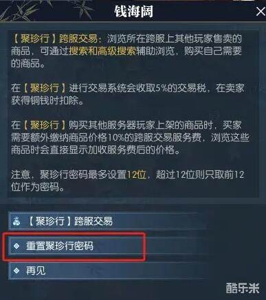 交易密码可在游戏里进行修改,很多玩家都想知道黄金服聚珍行密码在哪改,进入庙会随便找一个姓钱的NPC选择【重置聚珍行密码】,输入账号密码和将军令动态密码即可立即重置,接下来酷乐米小编给大家带来了详细的《逆水寒手游》聚珍行密码修改攻略!