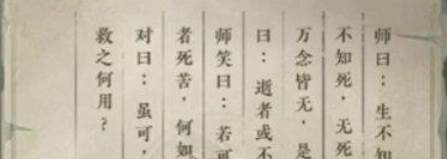答:来到九光寒林巨大石书旁,寻找破损的面具进行观察即可