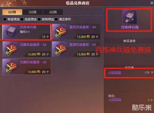 熔晶兑换商店,使用15个熔晶兑换百炼神兵箱