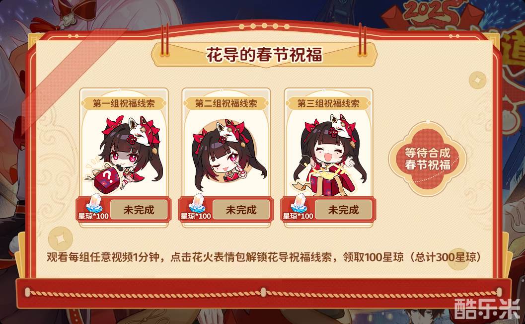 观看每组任意视频1分钟,点击花火表情包解锁花导祝福线索,领取100星琼(总计300星琼)