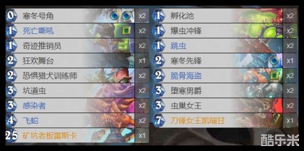 炉石传说异虫DK卡组怎么搭配?炉石传说里面很多人都想要尝试玩下这个异虫DK卡组了呢,毕竟这个版本的刀锋女王凯瑞甘了,返场与解场的实力都是很不错的,要是想玩的话可以来看看具体的搭配,下面和酷乐米小编一起来看看吧