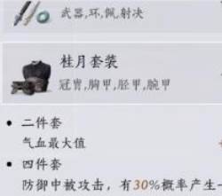 桂月套装的二件套效果是“气血最大值+40”,四件套效果为:在防御中被攻击时,有30%的概率生成一个吸收相当于最大气血值10%的护盾,护盾持续20秒。如果护盾已存在,则会额外回复2%的气血。此效果每60秒可触发一次。这套装属于防御增血类型,尤其适合陌刀门派,能够触发高达10%气血上限的护盾效果,也适合其他流派在单挑时使用,提升续航能力。
