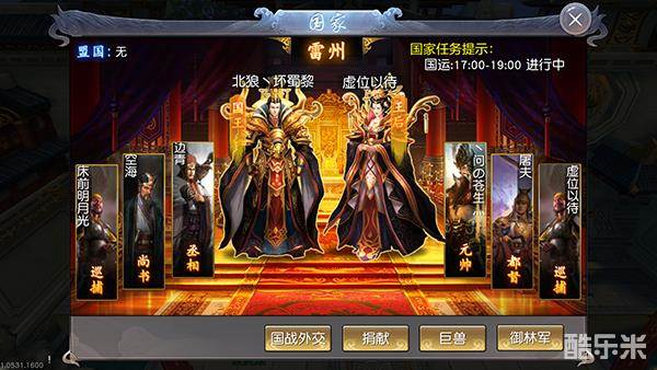 在国家界面中,占领本国王城的家族长就是国王,是一个国家至高无上的权位。国王可在国家公告中颁布国家活动时间等重要信息,国家活动开始时系统也会发出提示信息。作为一国之首,需要管理、制定国家的内政、外交、军事方针。而国王之下,也有6位辅佐大臣,分别是元帅、宰相和尚书、都督,两个巡捕,这些官职由国王直接任命。