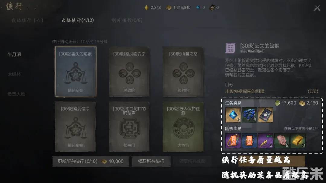 侠行任务每天凌晨4点刷新,可合理安排游戏行程,完成侠行可得丰富奖励,其中越高品质的任务,越有机会获得更多且更稀有材料道具,灵芝们还可消耗金币进行任务品质刷新。