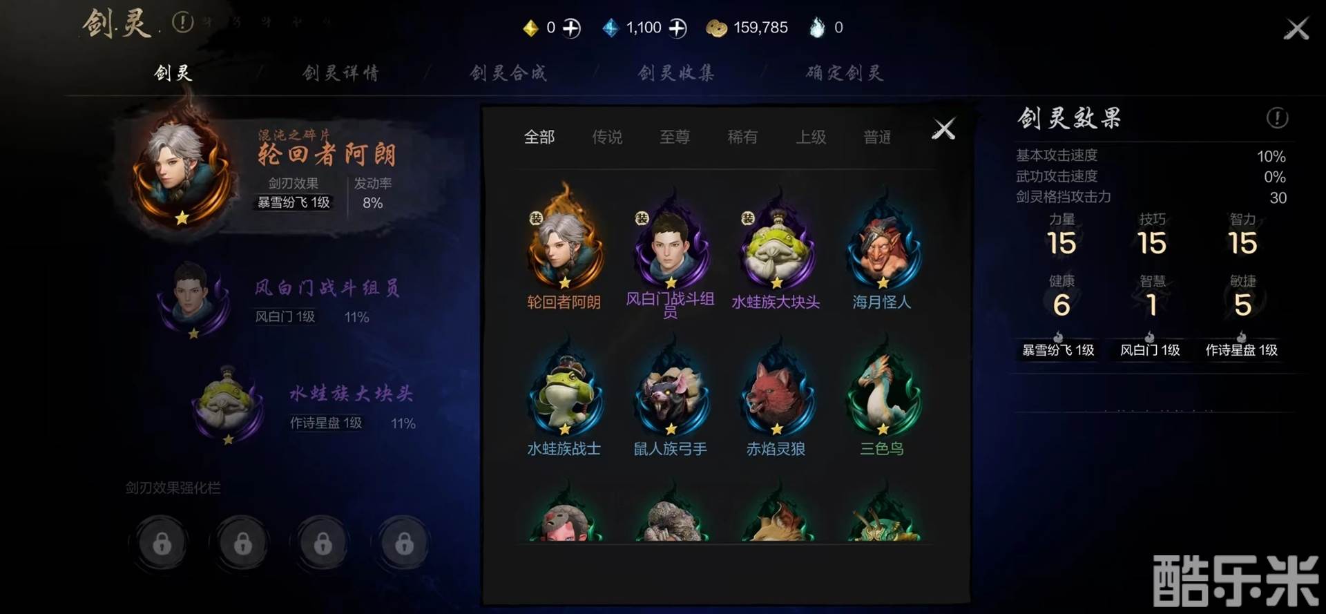 剑灵从品质从高到低可分为传说(粉色)、至尊(橙色)、稀有(紫色)、上级(蓝色)和普通(绿色)五种品质。