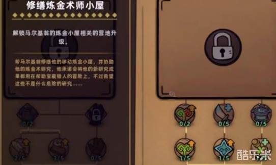 之后是炼金,名为”修缮炼金术师小屋”,处于界面中间的位置,需要先将马尔基翁的炼金小屋给解锁,才能来升级该营地的相关东西,炼金主要涉及的到的就是一些药水药品,对于角色生命值的回复,灵药容量等等方面是有影响的,能显著增强在野外时的生存能力。