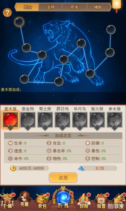 战士、法师、坦克、辅助4个职业对应着4张不同的星宿图,每一张星宿图只对应职业加成有帮助,而升级星宿图的材料是迷雾之尘,迷雾之尘需要击杀成功每一关卡后才能领取,从而用来升级星宿图。