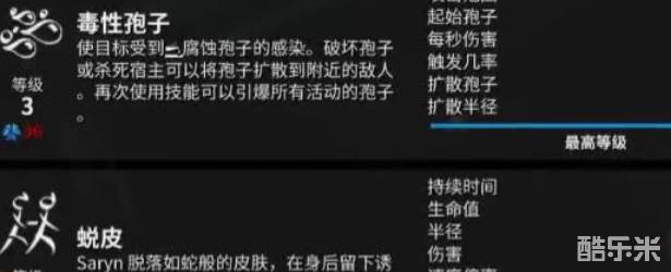 剧毒鞭笞,在激活的时候攻击会对敌人造成额外的毒素伤害,近战攻击的话则是双倍加成,被孢子感染的敌人受到该攻击会立刻引爆孢子。最后的“瘴气”,则可以释放毒气,范围毒伤,已经受到孢子感染的敌人会受到更深的感染。