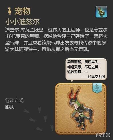 最终幻想14中有许多的宠物,很多玩家都想知道小小迪兹尔怎么获得,玩家花费25000金币在【鸟人族杂用商人】处购买即可获得,下面和酷乐米小编一起来看看吧