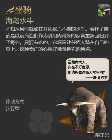 最终幻想14中有很多的坐骑,海岛水牛就是其中之一,有很多的玩家不知道要怎么获得这个坐骑,玩家需要探索无名岛,收集50000个谢尔达莱青船币,并且获得成就无人岛的伟大开拓者才可以兑换,下面和酷乐米小编一起来看看吧