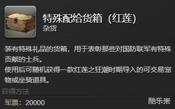2、军衔达到11级即可花费20000军票兑换【特殊配给货箱(红莲)】;