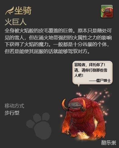 最终幻想14里有许多的坐骑,很多玩家都想知道火巨人怎么获得,玩家可通过【禁地优雷卡涌火之地】的金宝箱、特殊配给货箱红莲的方式获得,下面和酷乐米小编一起来看看吧