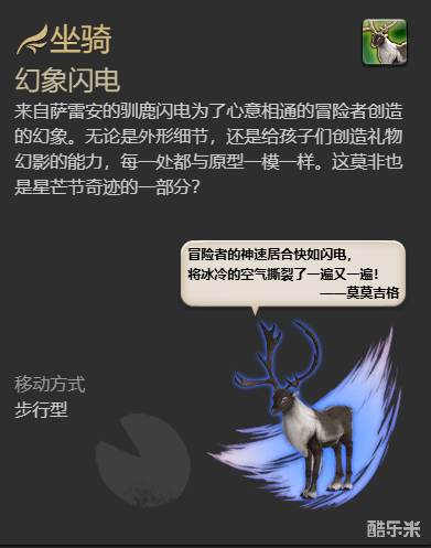 在最终幻想14中,有一个坐骑叫做幻象闪电,很多的玩家都非常的好奇这个坐骑要怎么样才能够获得,玩家需要完成星芒节活动的任务【星芒节与孩子们的幻影】,才可以获得这个坐骑,接下来酷乐米小编给大家带来了详细的《最终幻想14》幻象闪电坐骑获得方法!