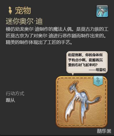 最终幻想14中有很多不同的宠物,迷你奥尔迪就是其中之一,很多的玩家不知道要怎么获得这个宠物,玩家需要完成任务后,前往商人贪吃的莫古姆力处花费30000金币来购买这个宠物,下面和酷乐米小编一起来看看吧