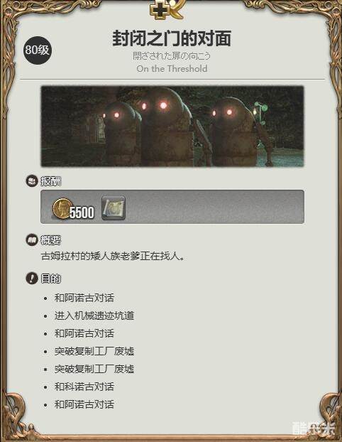 1、玩家等级达到80级,去珂露西亚岛(34.,18.2)找【矮人族老爹】开启任务【封闭之门的对面】;