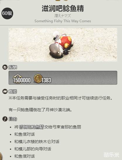 鲶鱼精族是最终幻想14中的一个蛮族,很多的玩家都非常的好奇这个蛮族的任务要怎么样才能够开启,玩家需要将自己的等级提升至60.并且完成任务【红色的祈愿】,完成两条线的前置任务后,就可以开启鲶鱼精族的蛮族任务,下面和酷乐米小编一起来看看吧