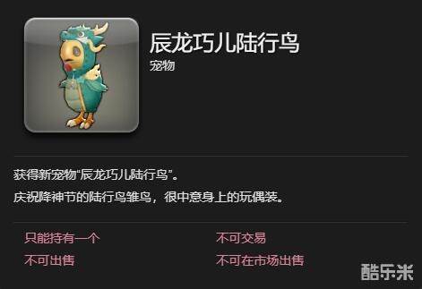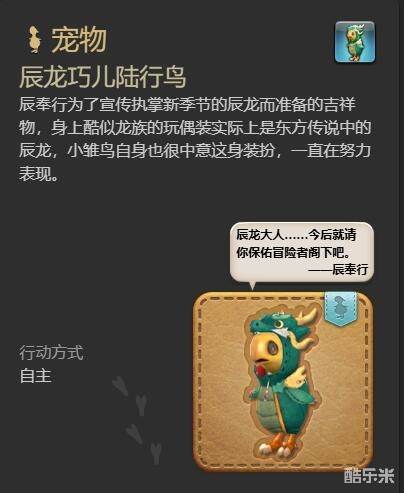 辰龙巧儿陆行鸟是最终幻想14当中的一个宠物,不少玩家不清楚最终幻想14辰龙巧儿陆行鸟宠物怎么获得,玩家可以完成任务获得,下面和酷乐米小编一起来看看吧