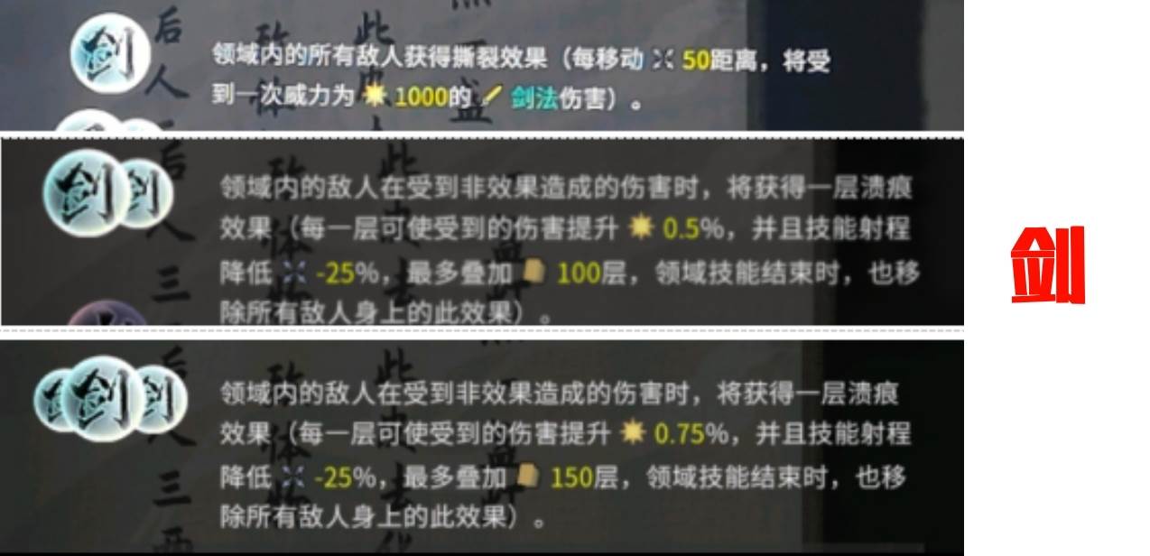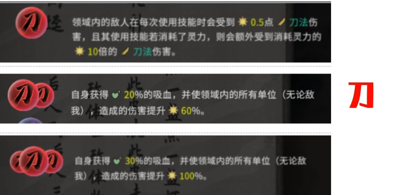1.领域内的敌人在每次使用技能时会受到来0.5点刀法伤害,且其使用技能若消耗了灵力,则会额外受到消耗灵力的10倍的刀法伤害。