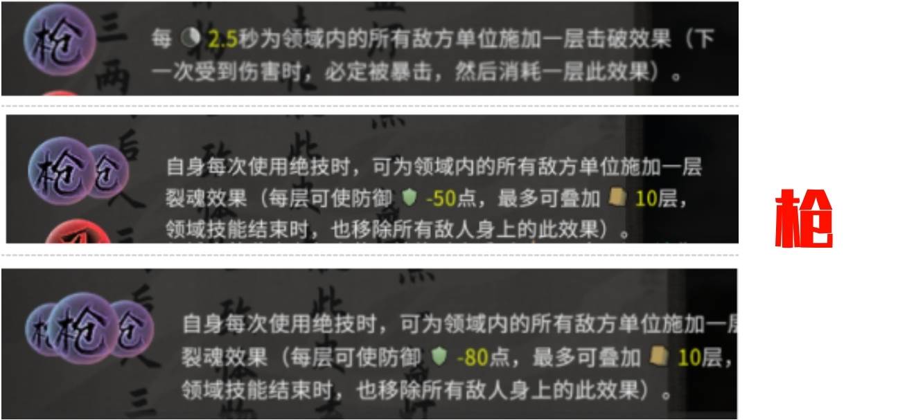 3.自身每次使用绝技时,可为领域内的所有敌方单位施加—月裂魂效果(每层可使防御-80点最多可叠加10层,领域技能结束时,也移除所有敌人身上的此效果)。