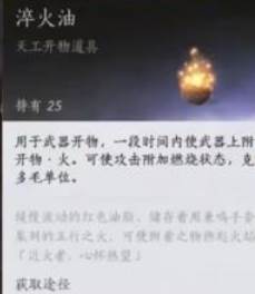 这个道具的效果是给武器添加一个天物·火的效果,如果添加效果的武器在命中后会有增加1.1%的火焰伤害。不同等级的淬火油效果不同,2级的效果是在持续性攻击后可以造成爆炸伤害,3级的效果是可以增加火焰效果10秒。这个道具可以在野外营地的火堆中获得;