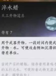 这个道具的效果是给武器添加一个天物·水的效果,让攻击附带一个沉滞的效果,可以对带有盾的角色有好的克制效果。当道具等级达到2级后,可以在附带效果的阶段提高防御能力,3级的效果是延长附带效果时间10秒。这个道具可以在不羡仙附近的水域获得;