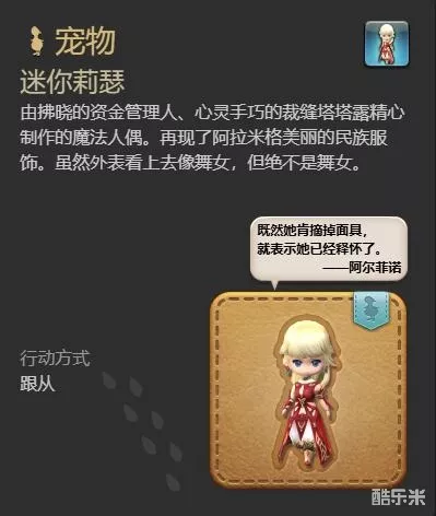 迷你莉瑟是最终幻想14当中的一个宠物,不少玩家不清楚ff14迷你莉瑟宠物怎么获得,玩家可以完成任务获得,下面和酷乐米小编一起来看看吧