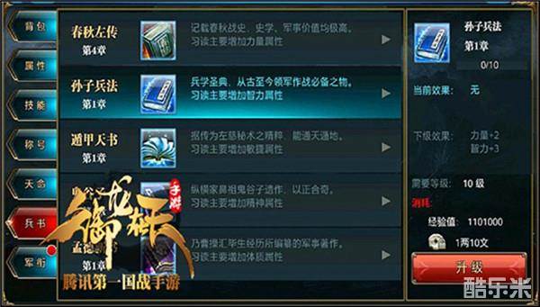 《御龙在天手游》作为国战经典游戏,要想立于不败之地,就要不断地提升人物属性,学习兵书,提升人物的基础属性。《孙子兵法》主要增加智力属性,下面我们一同来了解下这本兵书吧!