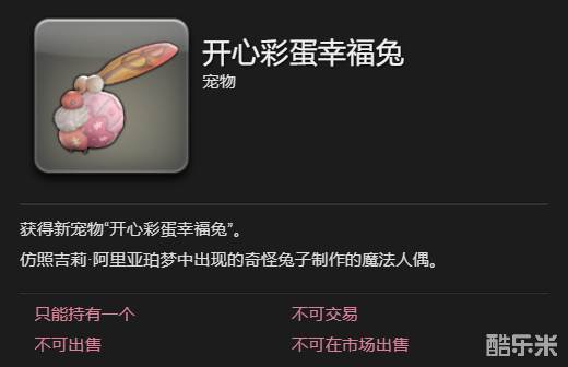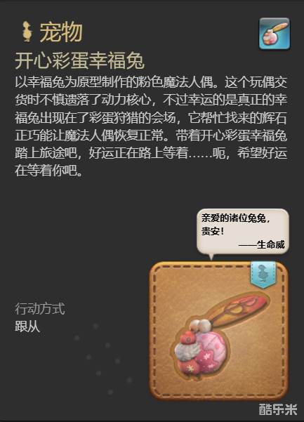 开心彩蛋幸福兔是ff14之中一只非常可爱的兔子类型的宠物,很多的玩家都非常的好奇这个宠物要怎么样才能够获得,玩家可以通过前往完成季节任务【彩蛋狩猎与狩猎幸福】获得,或是直接进行购买,下面和酷乐米小编一起来看看吧