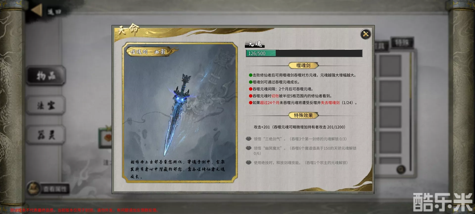 如果超过24个月未吞噬元魂将遭受反噬并失去噬魂剑(0/24)。(死亡也会失去噬魂剑,神器挡劫之后,噬魂剑会跑路,建议读档,长按存档界面中的人物头像可恢复至前几个的存档)
