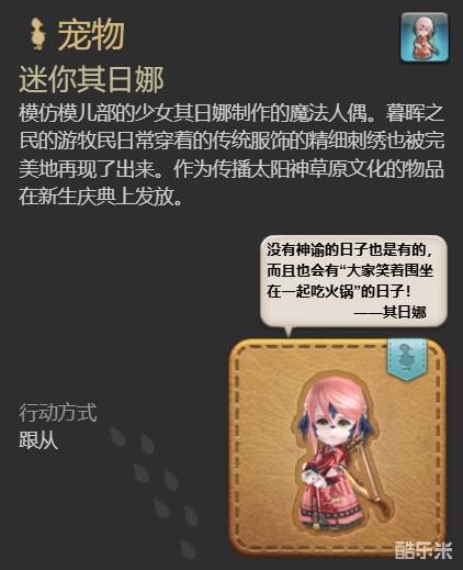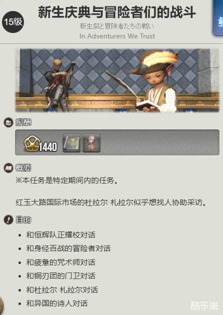 2、和他对话开启任务【新生庆典与冒险者们的战斗】,完成之后就可以获得迷你其日娜这个宠物了。