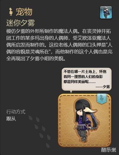 迷你夕雾是ff14当中的一个宠物,不少玩家不清楚ff14迷你夕雾宠物怎么获得,玩家可以完成任务、购买道具获得,下面和酷乐米小编一起来看看吧