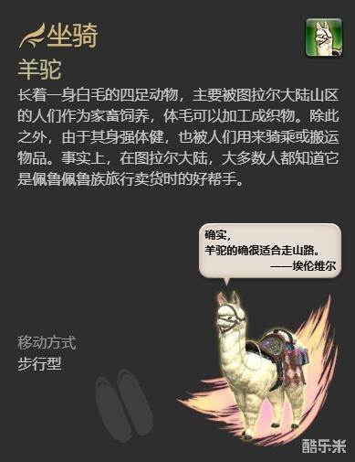羊驼是尤卡图拉尔特有的四足动物,很多玩家都想知道羊驼坐骑怎么获得,在活着的记忆找【乌克·拉玛特】接任务并完成【金曦之遗辉】即可获得,下面和酷乐米小编一起来看看吧