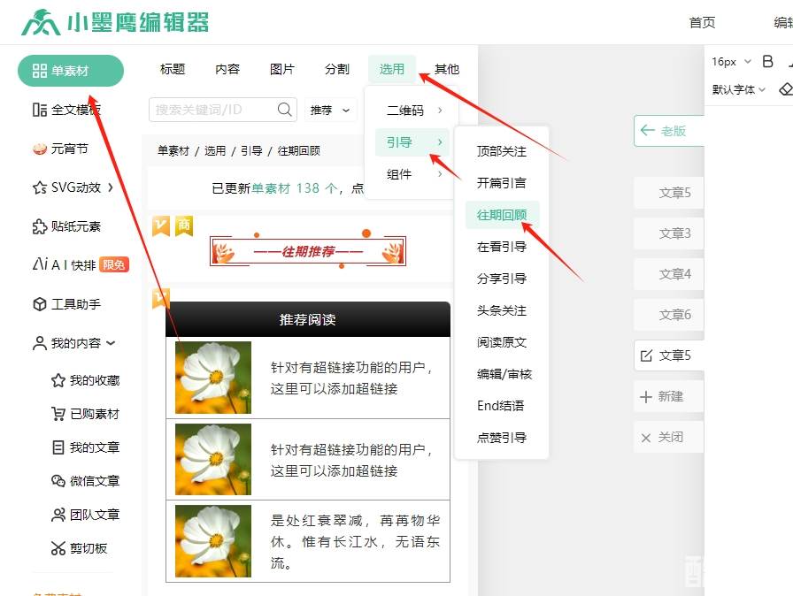 首先,打开小墨鹰编辑器,在左边的单样式里找到“选用-引导 - 往期回顾”这一项。